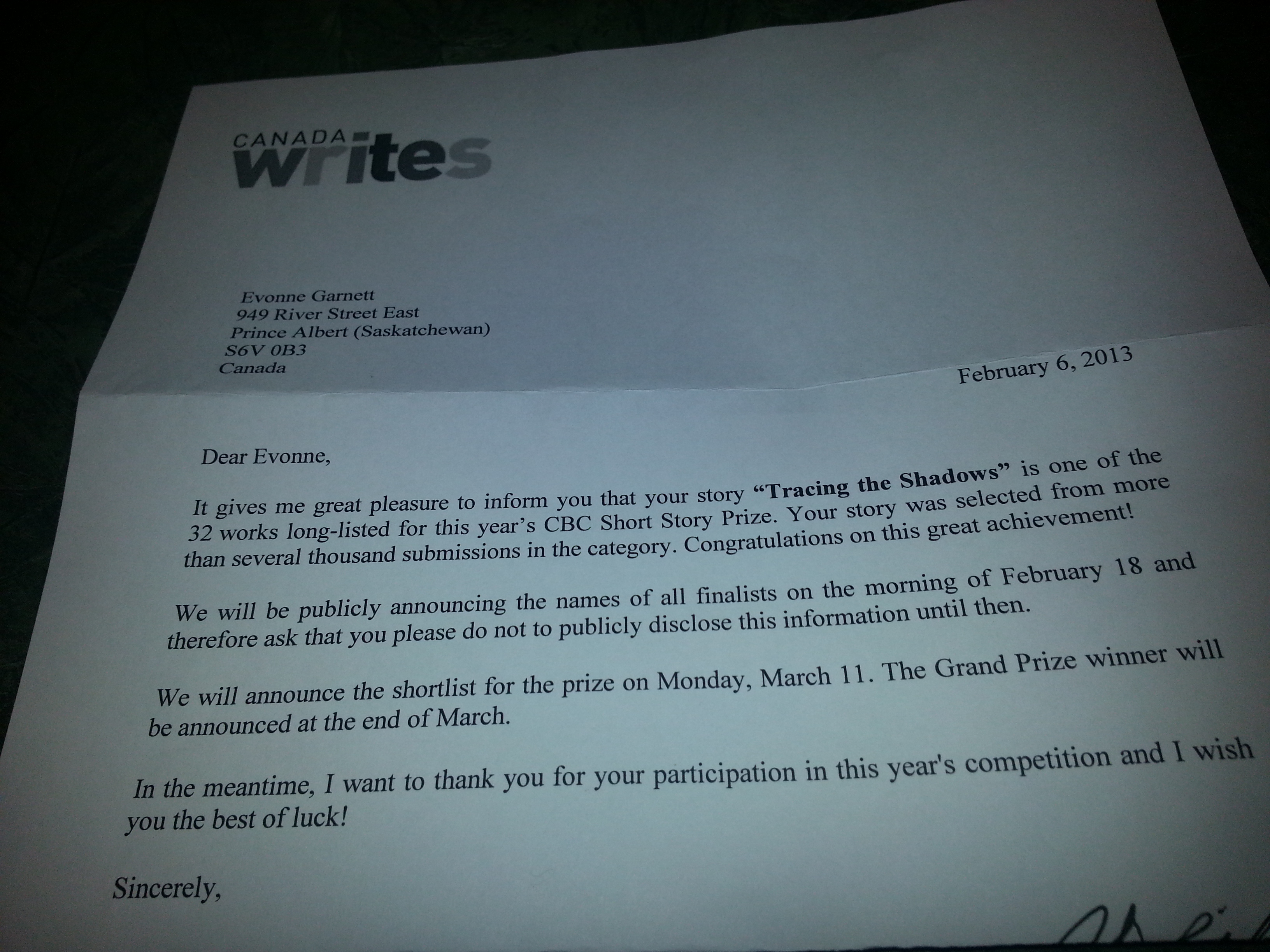 I retrieve the letter from the floor and begin again:  Dear Evonne, /It gives me great pleasure … **pleasure??  They never start with giving great pleasure!!** … It gives me great pleasure to inform you that your story “Tracing the Shadows” is one of the 32 works long-listed for this year’s CBC Short Story Prize.