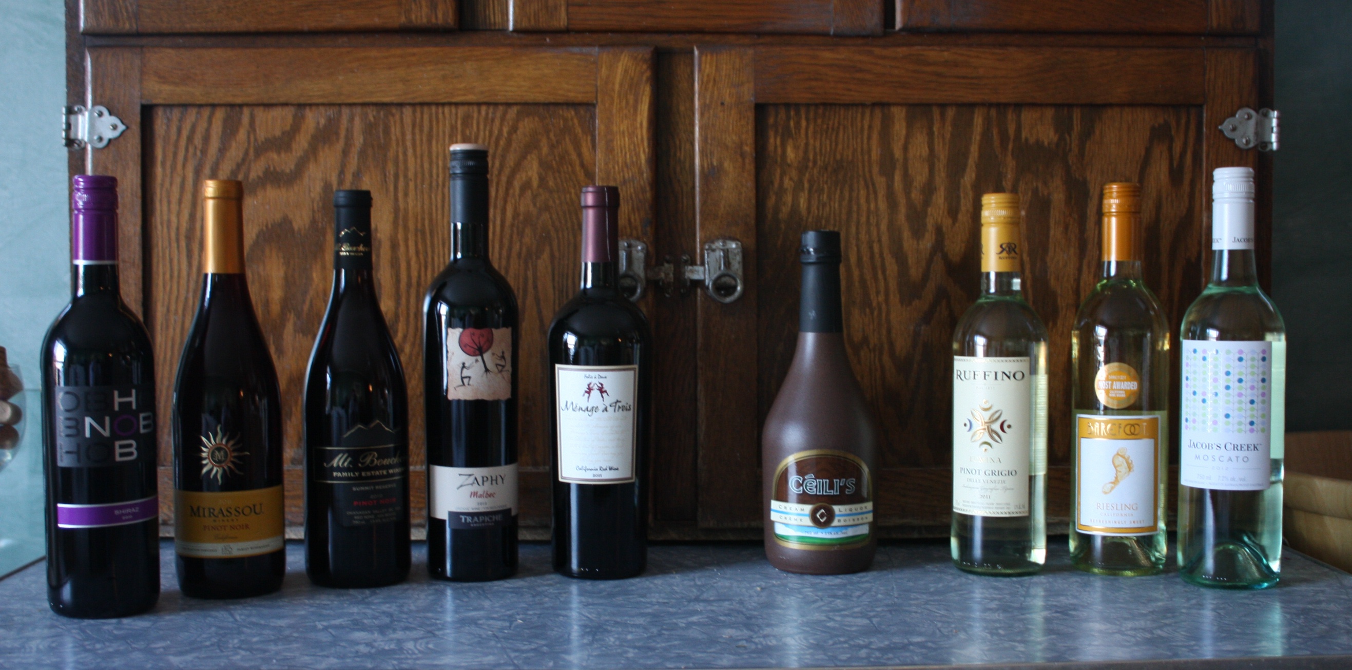 Shiraz, Pinot Noir, Pinot Noir, Malbec, Menage a Trois, Irish Cream, Pinot Grigio, Riesling, Moscato: all set for, like, the next six months!