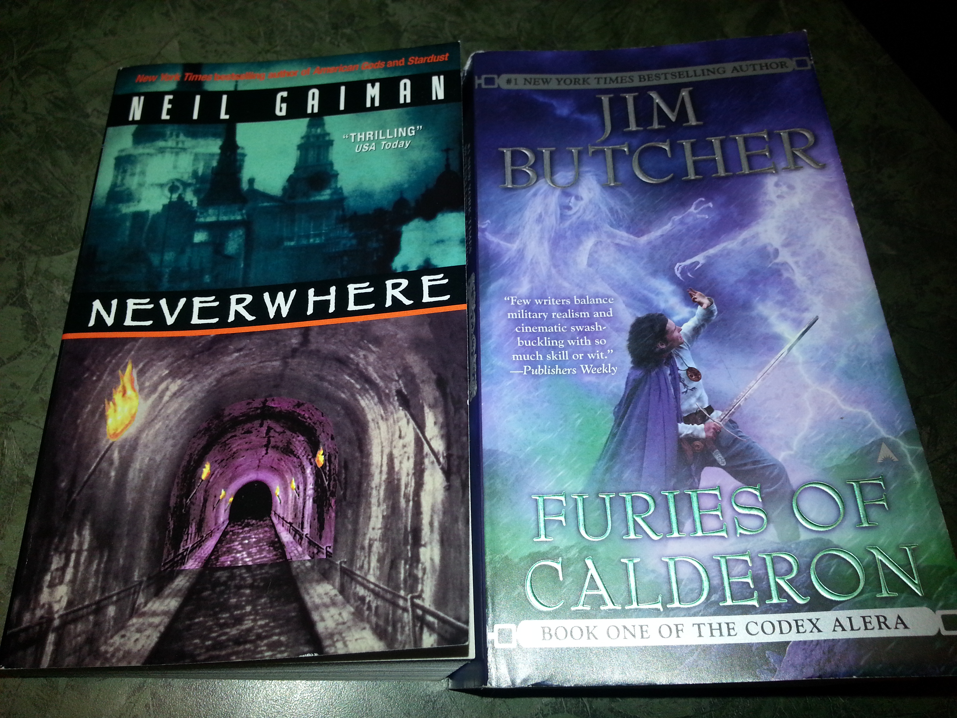 And here the backstory ends.  I was in a bookstore over the New Year’s searching for some appropriate novel for my godson:  fifteen, not an avid reader particularly, though he does love a good story as much as anyone.  I was conferring with a fellow in the store who seemed well enough read about what he felt such a boy might like to read.  He brought me over to a section to recommend a text by I don’t remember who because I wasn’t paying attention:  there, on the shelf, where they shamelessly display covers amidst spines, sat “Neverwhere”. Mr. Gaiman, I picked it up.  And the fellow noticed. He commented that it was a riveting read and recommended it.  I held it in my hands with the half dozen other books and meandered among the aisles, bamboozled by my senses.  In a moment of clarity I wondered if Godson would enjoy Harry as much as Hubby did, and wandered over to see if Mr. Butcher’s books were being hussied about and sure enough, … but here Harry’s spines were modestly displayed and catching my attention was the immodest spectacle that was the fully exposed cover of “Furies of Calderon”. I picked it up also.