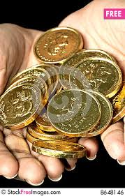 A handful of gold coins, all different varieties, maybe a dozen in all.